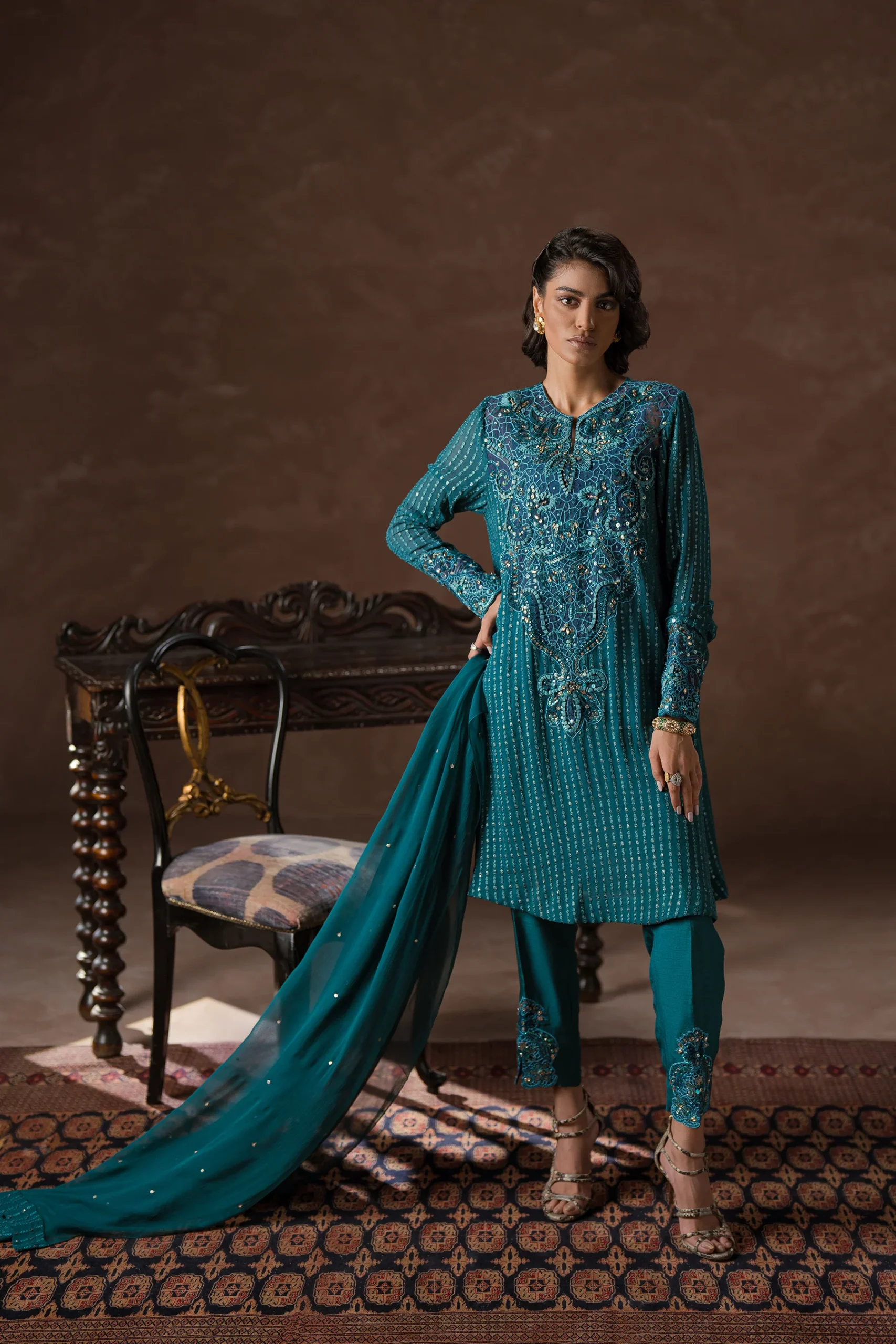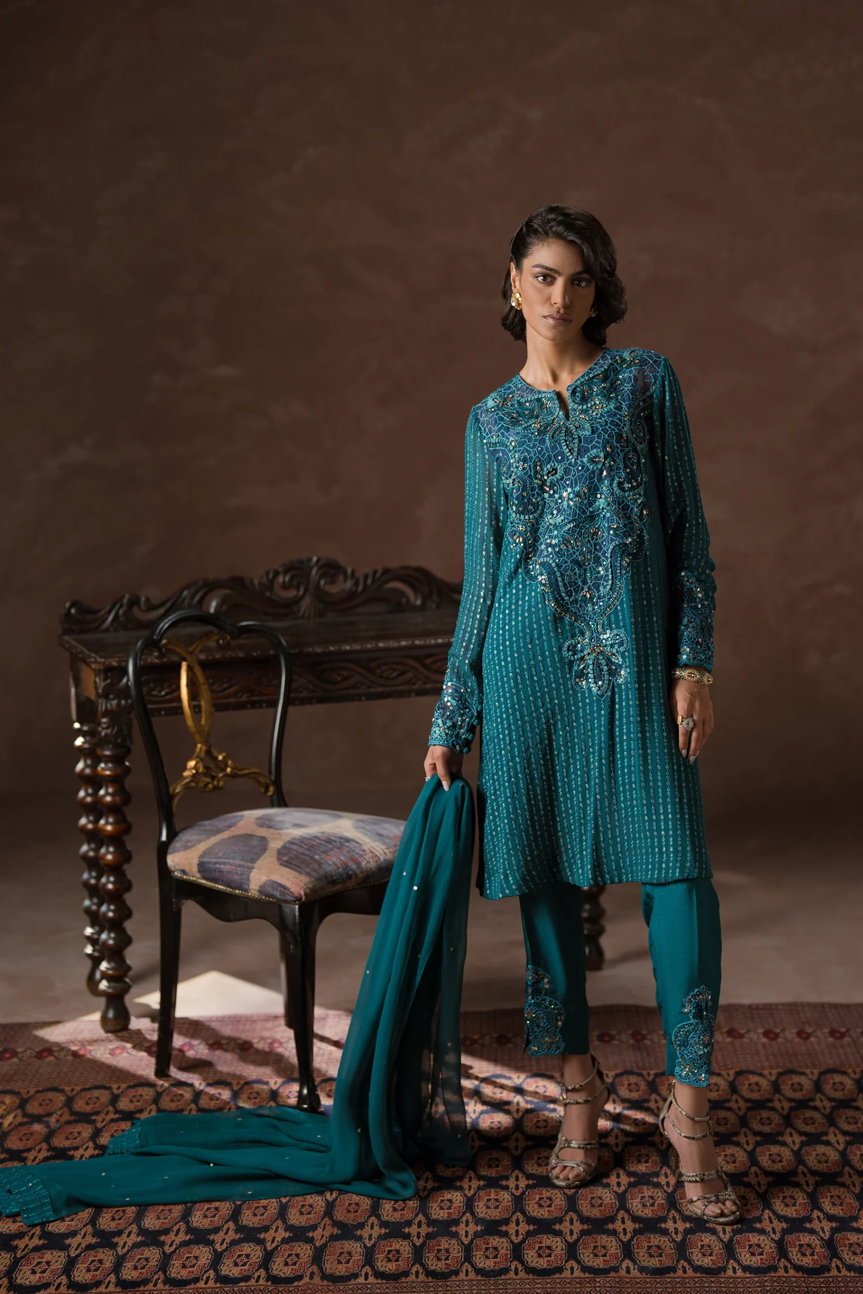 Contemporary Cool matching co-ord set is enhanced with beautiful tone on tone hand embellishment using matte crystals, sequins ‘chapti dori’ and resham work on the statement neckline, sleeves and pants. A beautiful AMMARA KHAN embroidered chiffon fabric is the canvas for our shirt, which is then further beautified with the artistic detailing. A matching chiffon dupatta with a light spray adds further detail. Chic and stylish, this stunning teal design is sophisticated and oozing with modern elegance.