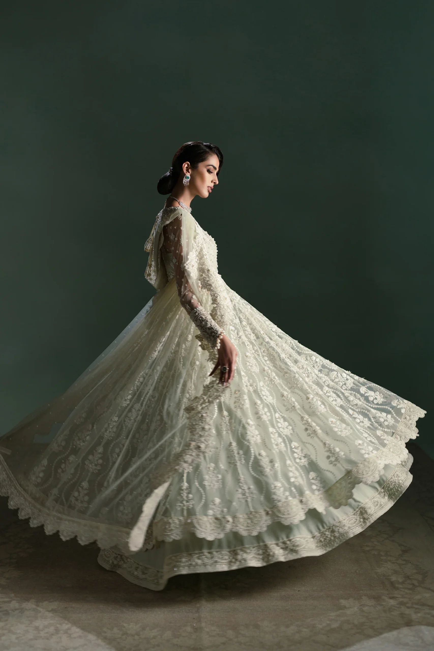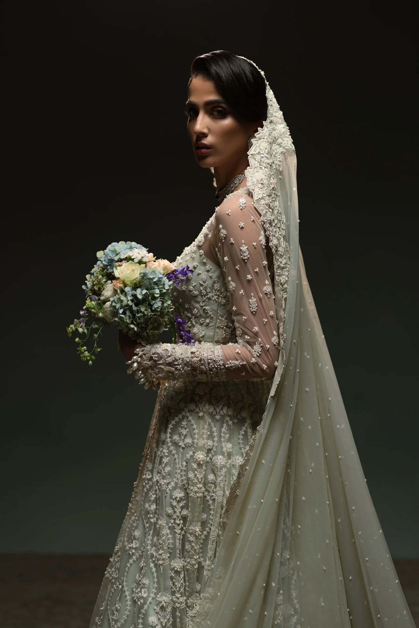 This stunning peshwas is designed with a fully hand-embellished bodice and sleeves, an ode to AMMARA KHAN’s celebrated craftsmanship. The embroidered panels come with detailed handwork that adds depth to the design. This exquisite design is further beautified with a striking, fully hand embellished scalloped dupatta with a play of two unique borders and an all over spray. A flowy lehnga featuring an embroidered border with additional handwork, completes this sophisticated look. This beautiful design is sure to be a standout, statement look for a Nikah or engagement bride, artistic and timeless.