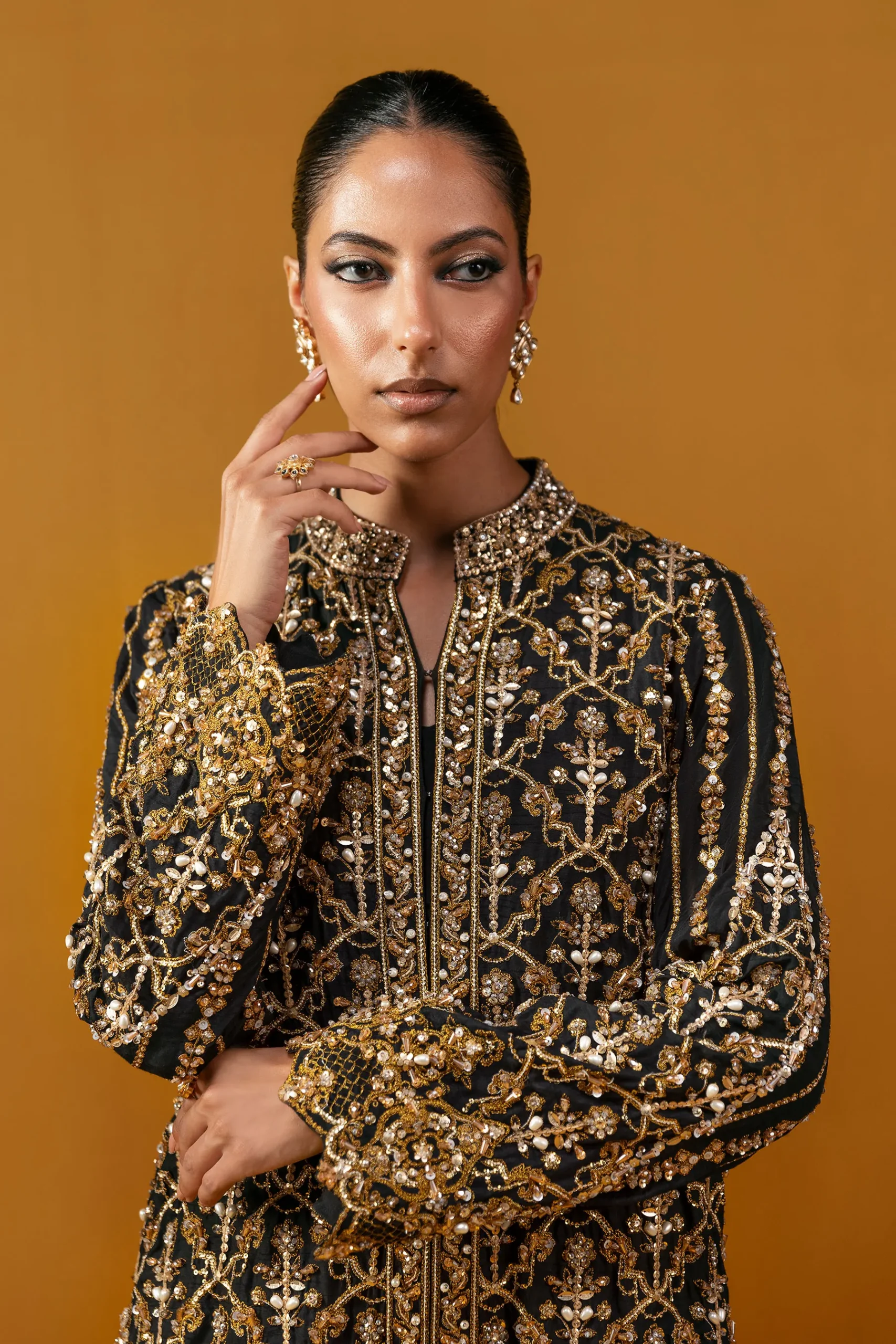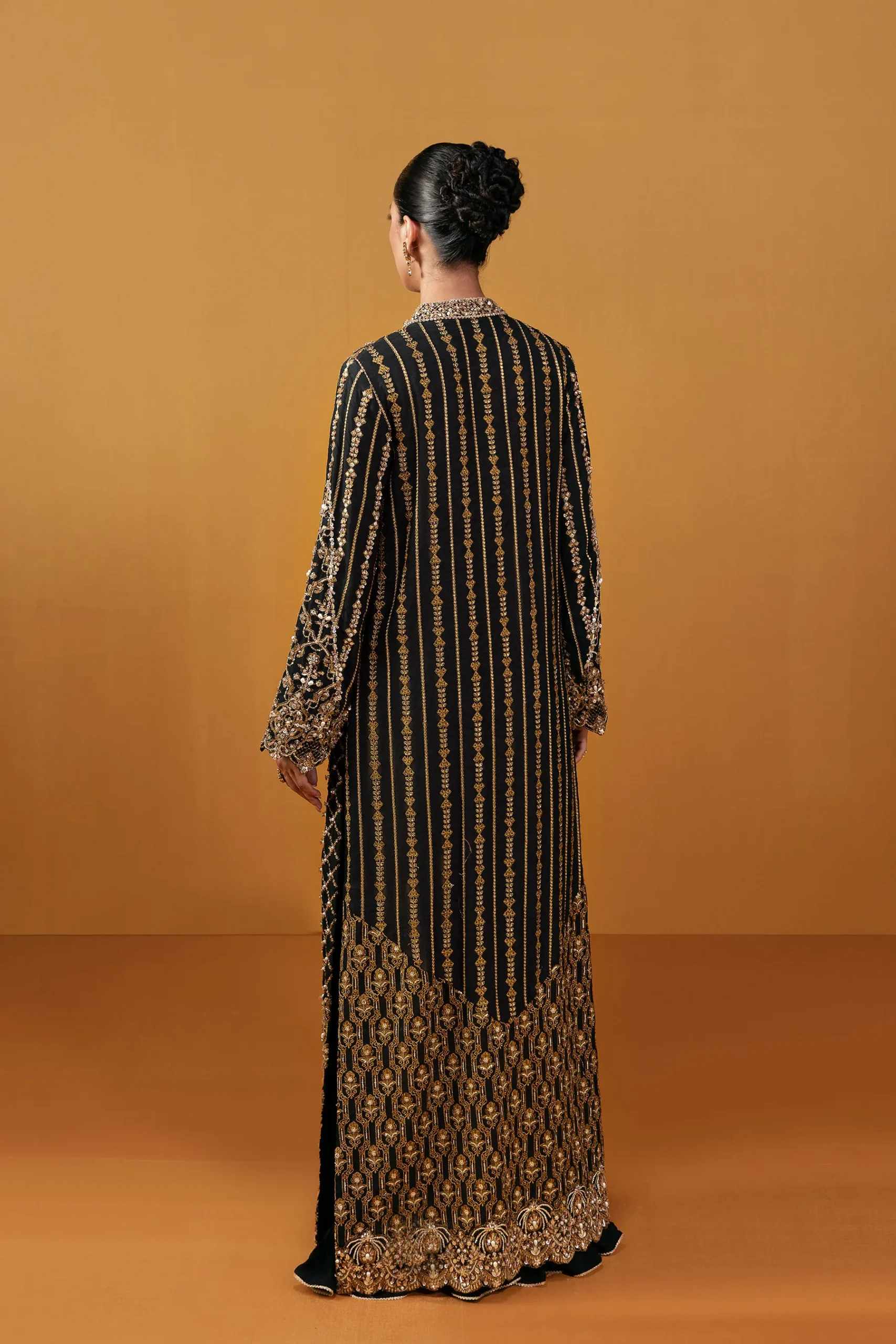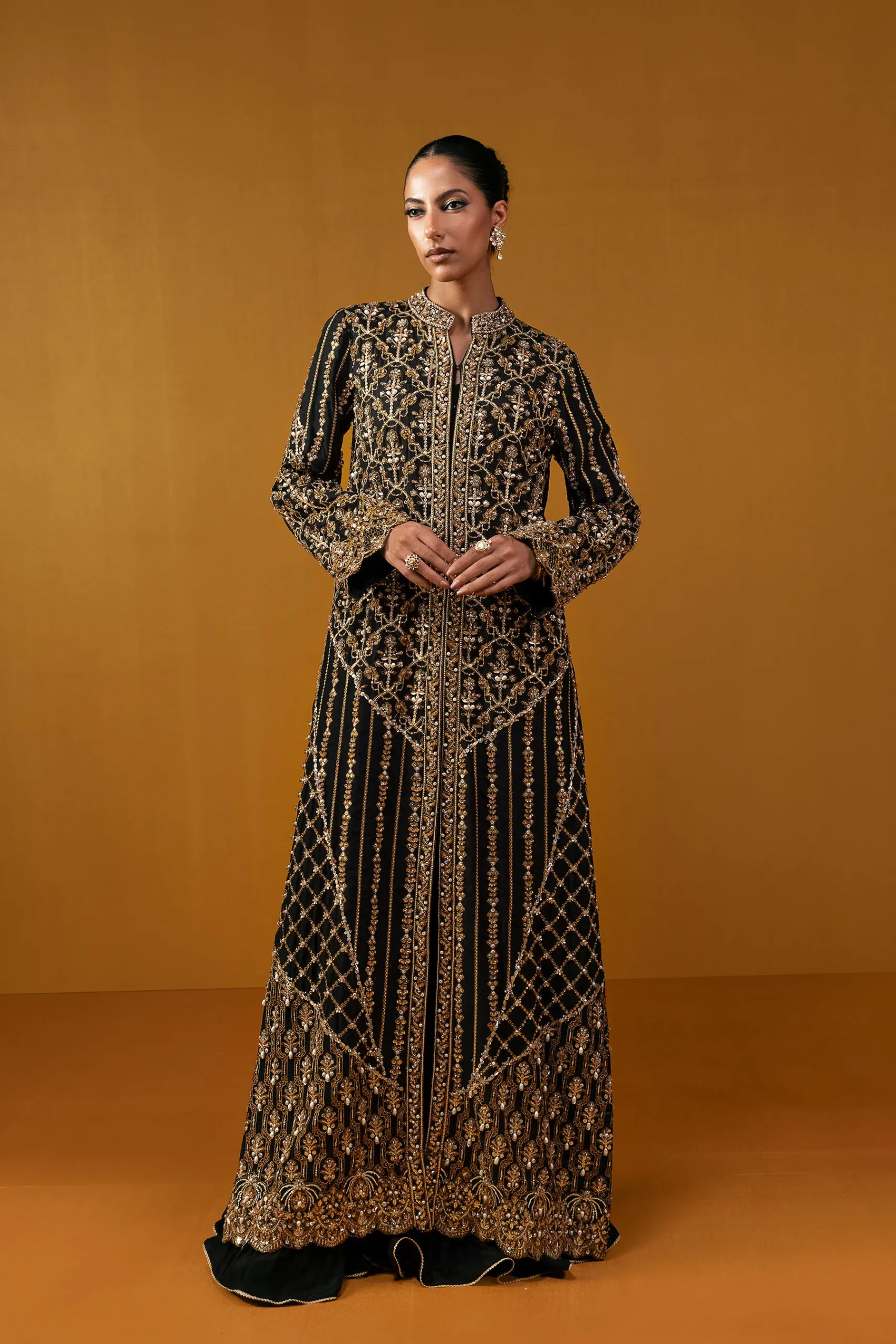 AMMARA KHAN presents a striking black creation, drenched in the opulence of intricate gold embellishments. The long, structured silhouette flows gracefully, paired with crushed wide-leg trousers that add effortless movement. This outfit also includes a matching blouse underneath. Rich embroidery weaves across the shirt, with ornate motifs enhancing the neckline and sleeves. Full-length sleeves finish in richly embellished cuffs, highlighted with sequins and beads that add a luminous shimmer. A statement piece of sophistication and artistry, this ensemble exudes pure luxury.
