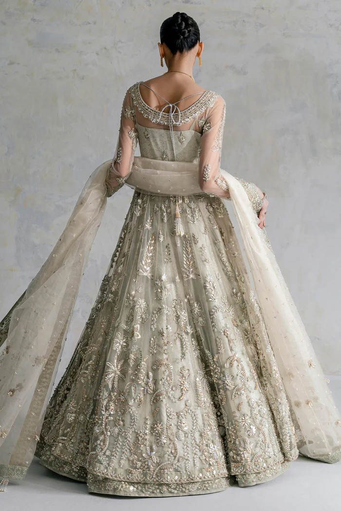 This AMMARA KHAN creation embodies refined elegance with a contemporary twist. A fluid, embellished drape cascades gracefully from one sleeve, while the other shimmers with intricate handwork. The silhouette flows effortlessly in a straight, floor-length cut, paired with wide-leg pants that move elegantly with every step. A high neckline with delicate shoulder cut-outs adds a modern touch and beautifully frames the intricately adorned bodice. The hemline glistens with refined detailing, completing the look with understated opulence.